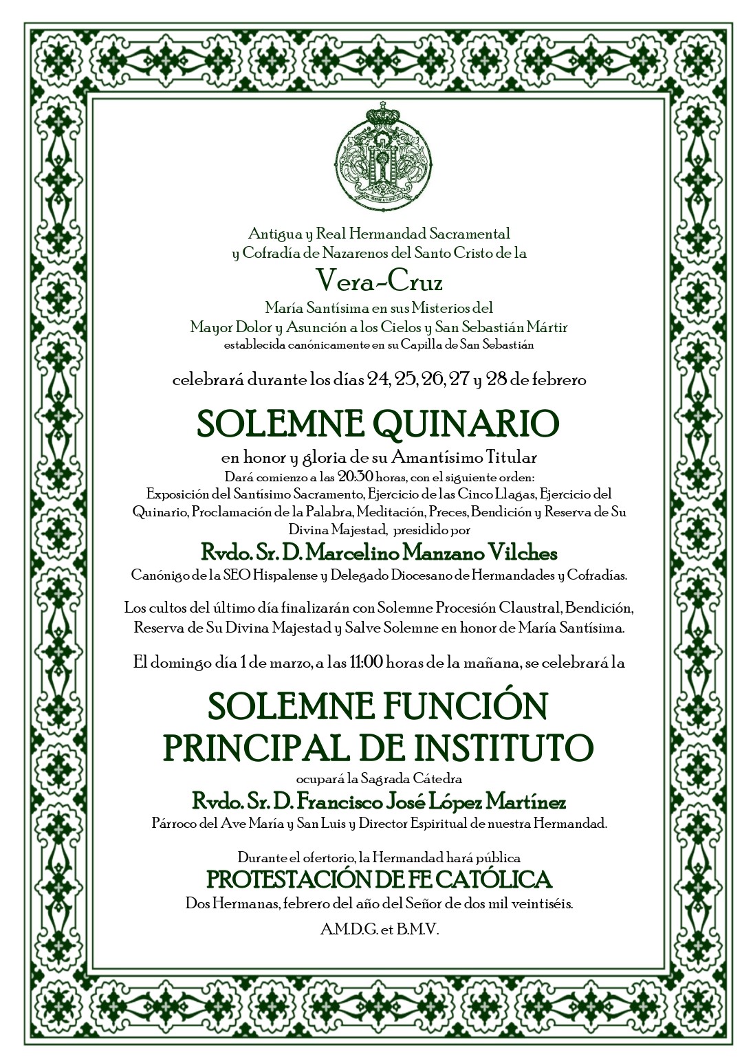 Desde el martes 24 y hasta el sábado 28 de febrero, la Hermandad Sacramental de la Santa Vera-Cruz celebra el Solemne Quinario en honor y gloria del Santo Cristo de la Vera+Cruz. Los cultos comenzarán a las 20:30 horas con el siguiente orden: Exposición del Santísimo Sacramento, Ejercicio de las Cinco Llagas, Ejercicio del Quinario, Proclamación de la Palabra, Meditación, Preces, Bendición y Reserva de Su Divina Majestad, presidido por el Rvdo. Sr. D. Marcelino Manzano Vilches, Canónigo de la SEO Hispalense y Delegado Diocesano de Hermandades y Cofradías. Los cultos del último día finalizarán con Solemne Procesión Eucarística, Bendición, Reserva y Salve Solemne en honor de María Santísima. El domingo 1 de marzo, a las 11:00 de la mañana, se celebrará Solemne Función Principal de Instituto en la que ocupará la sagrada cátedra el Rvdo. Sr. D. Francisco José López, párroco del Ave María y San Luis y director espiritual de nuestra Hermandad. Durante el ofertorio, la Hermandad hará pública Protestación de Fe Católica. Animamos a nuestros hermanos, fieles y devotos a participar de este tiempo de reflexión y penitencia que nos conduce hacia la Pasión, Muerte y Resurrección de Nuestro Señor Jesucristo, participando en los cultos y actos de nuestra Hermandad. Hagamos compromisos concretos para convertirnos al Señor en Cuaresma y crecer en su amor a través del ayuno, la oración y la caridad.