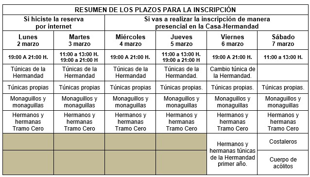 Podrán inscribirse en la lista de Cofradía, recogiendo su papeleta de sitio, los días 4, 5 y 6 de marzo en horario de 19:00 a 21:00 horas (el jueves 5 también en horario de 11:00 a 13:00 horas) y el sábado 7 de marzo, en horario de 11:00 a 13:00 horas en nuestra Casa-Hermandad.